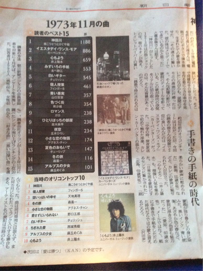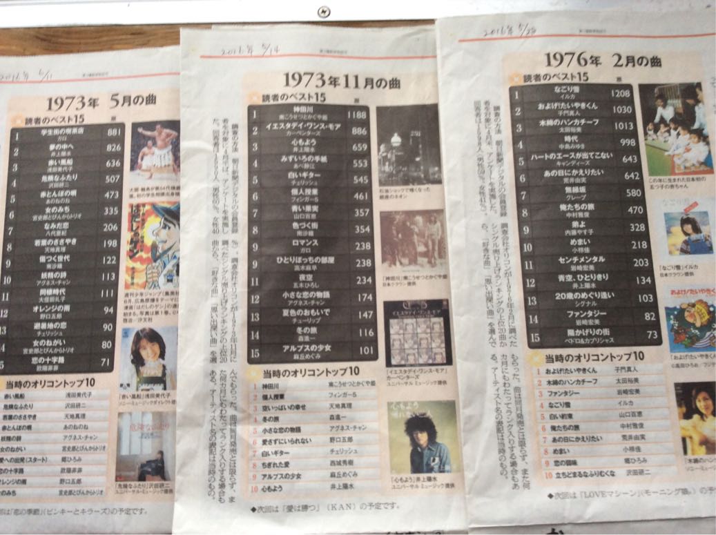 新聞に戻ると「神田川」の回が1973年11月(心もよう)、今回のは76年2月だから2年3ヶ月後(青空、ひとりきり)。そして今日6月11日(土曜日)の特集は1973年5月「赤い風船」の回。読者のベスト15の2位が「夢の中へ」!